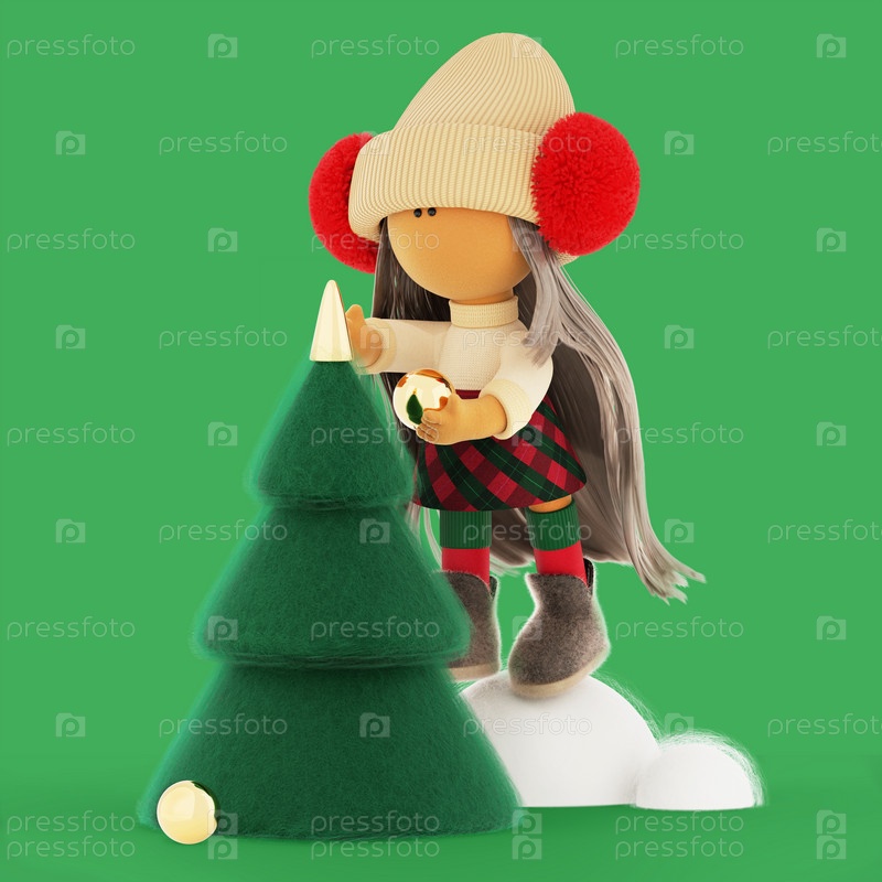 Блондинка украшает елку золотым шаром Молодая текстильная кукла в кремовом вязанном свитере и клетчатой юбке из шотландской клетки 3D-рендеринг для зимних новогодних праздников Зеленый фон