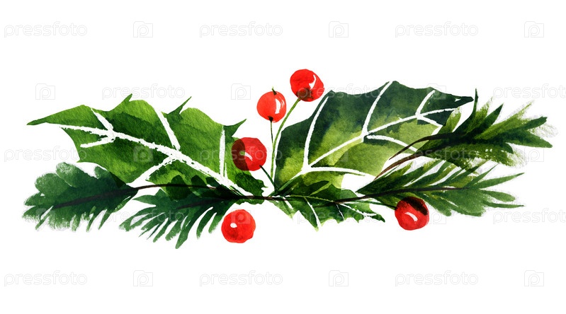 Букет из новогодней елки и остролиста. Акварельная ботаническая наклейка для милых рождественских и новогодних поздравлений и пригласительных открыток
