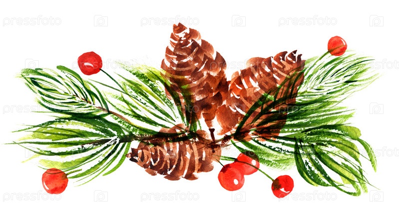 Букет из ветвей новогодней елки, шишек и ягод падуба. Акварельная ботаническая наклейка для милых рождественских и новогодних поздравлений и пригласительных открыток