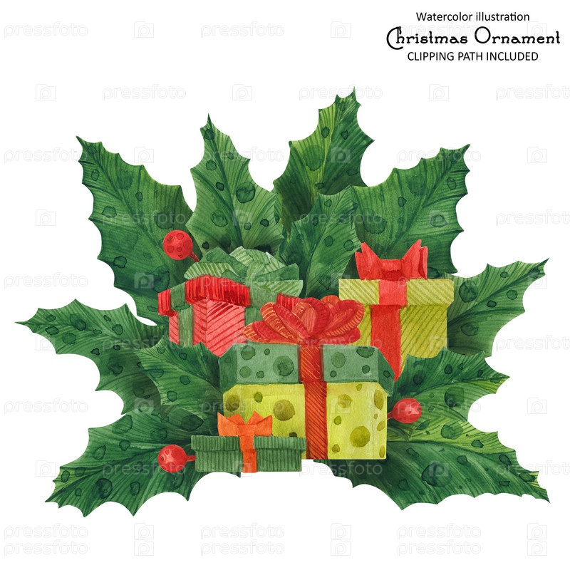 Рождественский букет Холли с подарочными коробками, акварельная иллюстрация