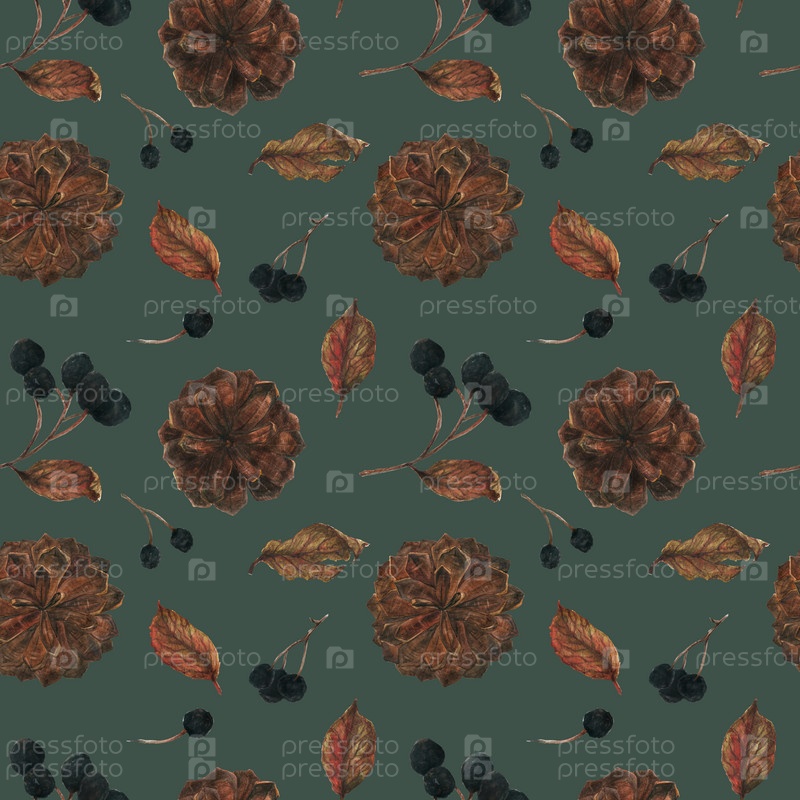 Арония и сосновые шишки на Рождество темный бесшовный узор