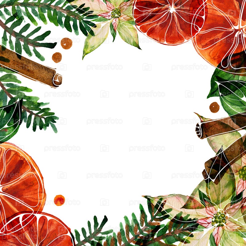 Рождественская текстовая квадратная рамка с акварельной пуансеттией, элем и специями