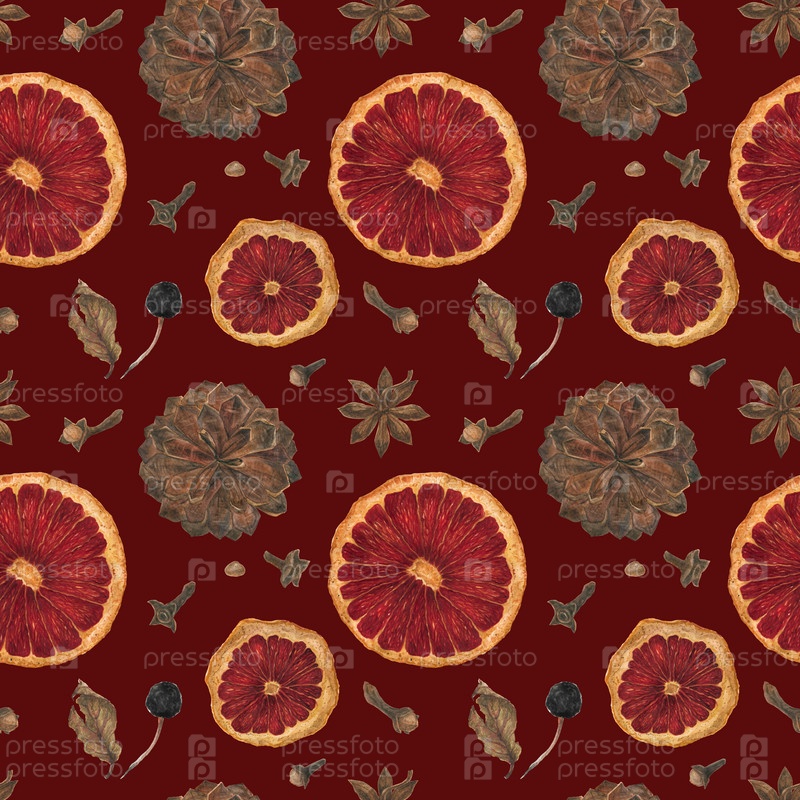 Рождественский бесшовный узор с апельсинами, специями и шишками на красном