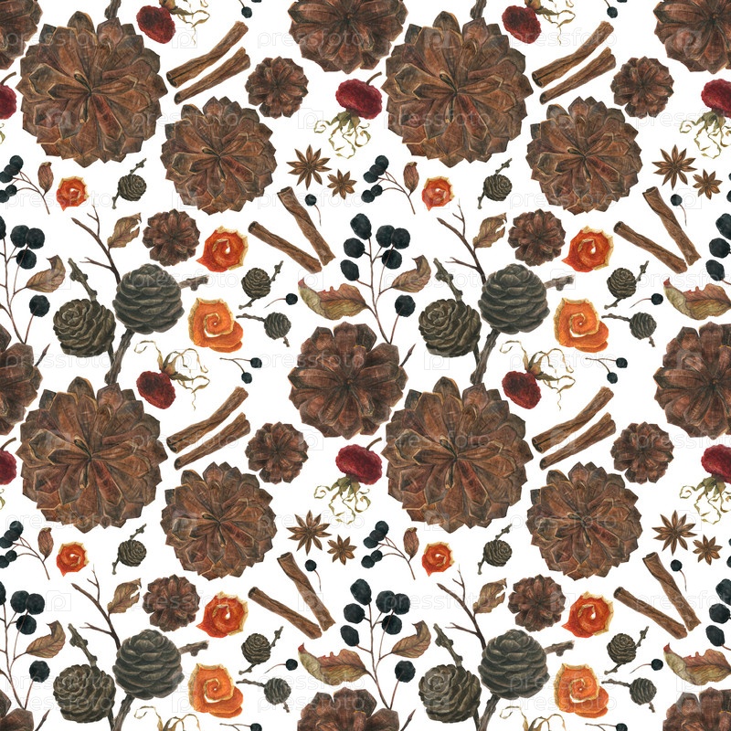 Зимние растения и специи для новогоднего акварельного бесшовного рисунка