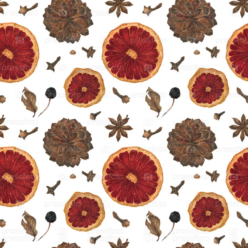 Рождественский бесшовный узор с апельсинами, специями и шишками на белом