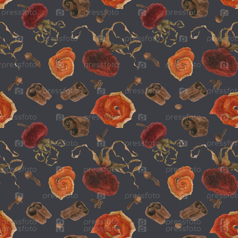 Рождественские горячие напитки, специи и бедра для акварельного синего бесшовного рисунка