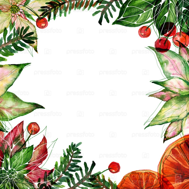 Рождественская текстовая квадратная рамка с акварельной пуансеттией, апельсинами и красными ягодами