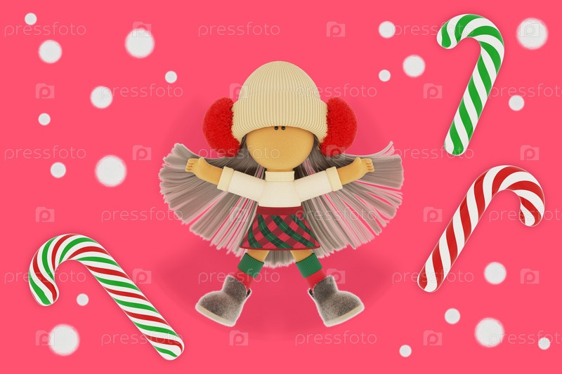 Молодая текстильная кукла в кремовом вязанном свитере и клетчатой юбке в шотландской клетке 3D-рендеринг к зимним новогодним праздникам розовый фон
