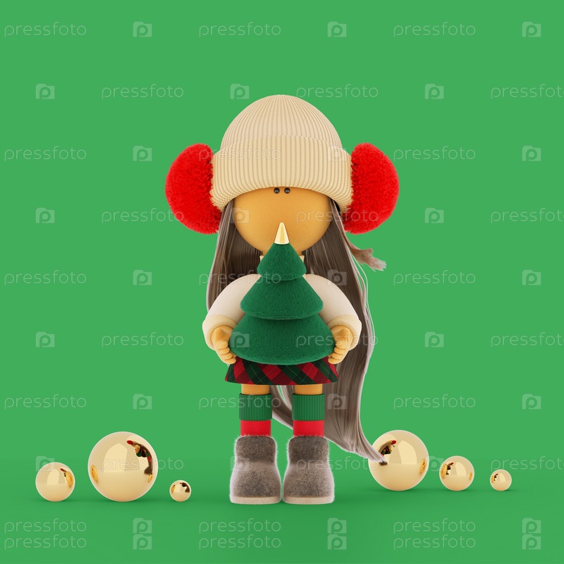 Милая белокожая тканевая кукла с фитровой елкой и золотыми шарами. Молодая текстильная кукла в кремовом вязанном свитере и клетчатой юбке из шотландской клетки. Иллюстрации 3D-рендеринга к зимним новогодним праздникам. Зеленый
