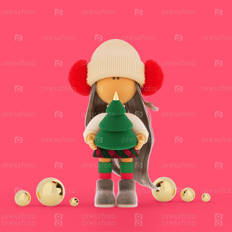 Милая белокожая тканевая кукла с фитровой елкой и золотыми шарами. Молодая текстильная кукла в кремовом вязанном свитере и клетчатой юбке из шотландской клетки. Иллюстрации 3D-рендеринга к зимним новогодним праздникам. Розовый