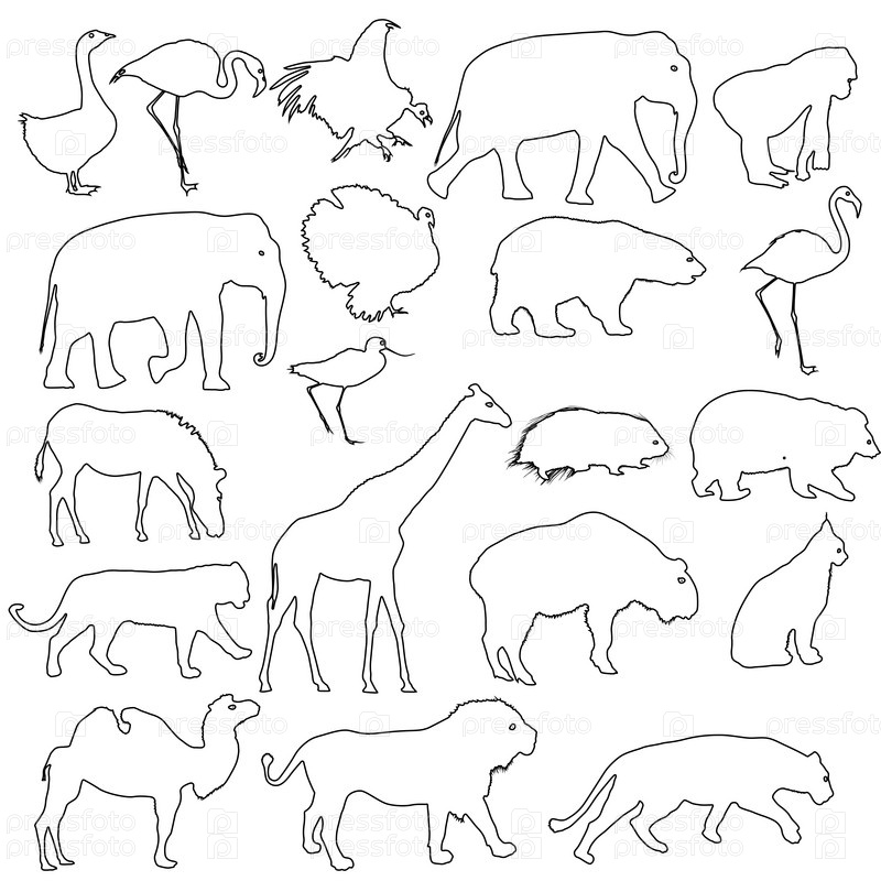 Силуэт слона, медведя, орла, рыси, утки, зебры на белом фоне
