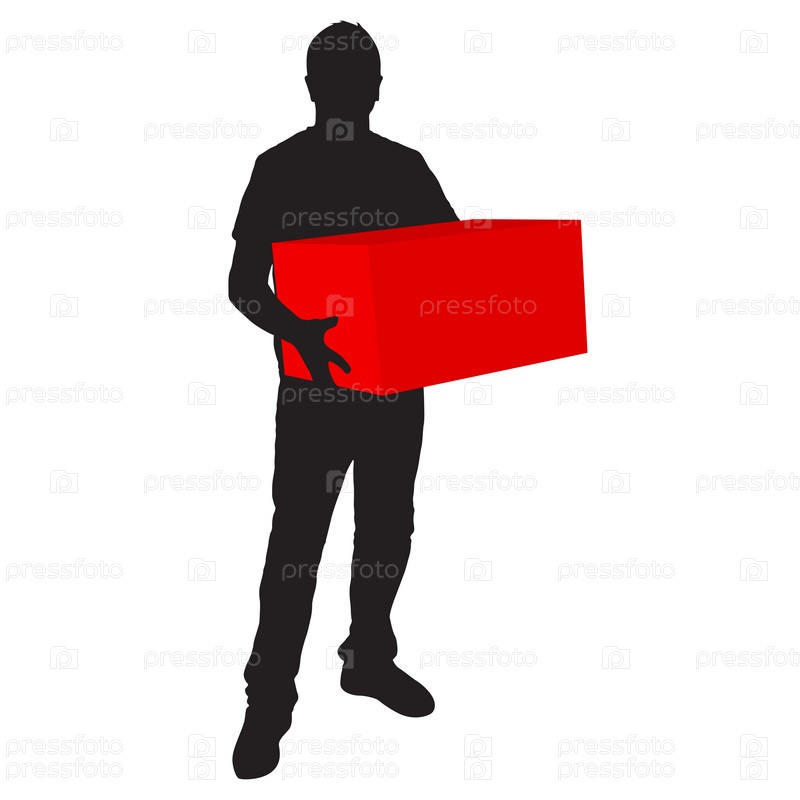 Силуэт доставщика, несущего коробку на белом фоне