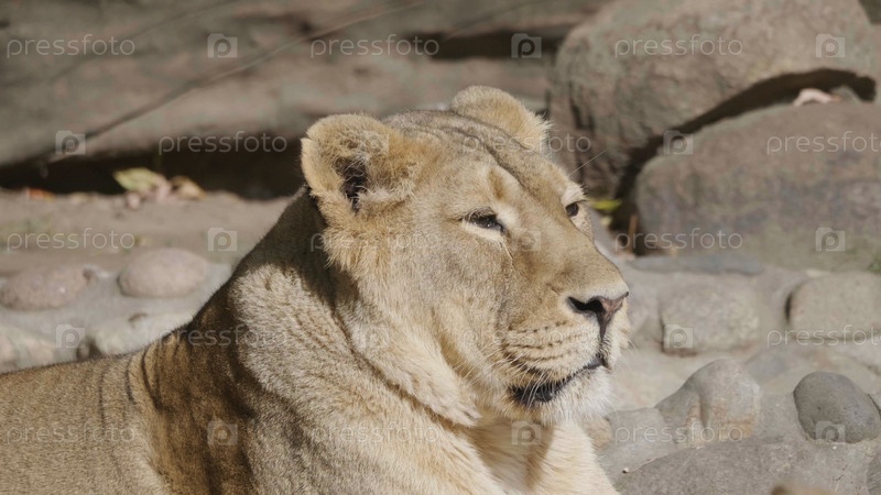 Портрет львицы, греющейся под теплым солнцем после ужина
