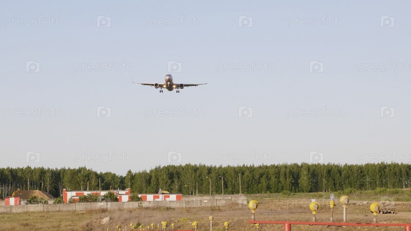 Коммерческий пассажирский самолет летит над головой в солнечный день