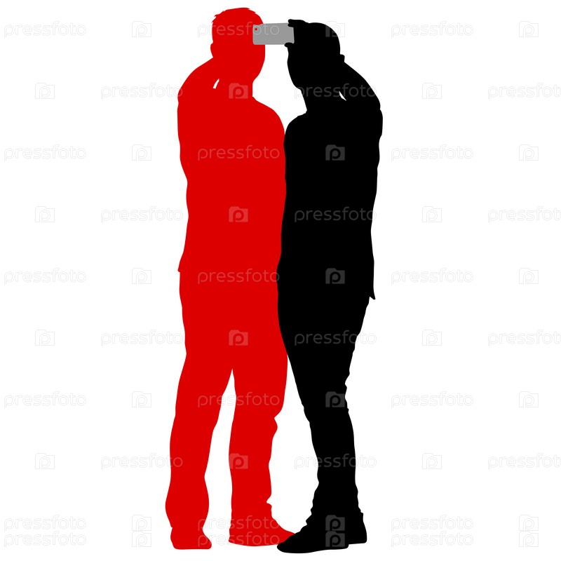 Силуэты мужчины, делающего селфи со смартфоном на белом фоне