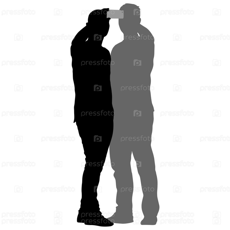 Силуэты мужчины, делающего селфи со смартфоном на белом фоне