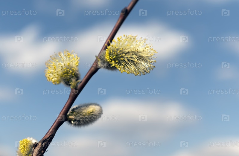 Красивые ветви вербы на фоне голубого неба, праздник Пасхи в Вербное воскресенье