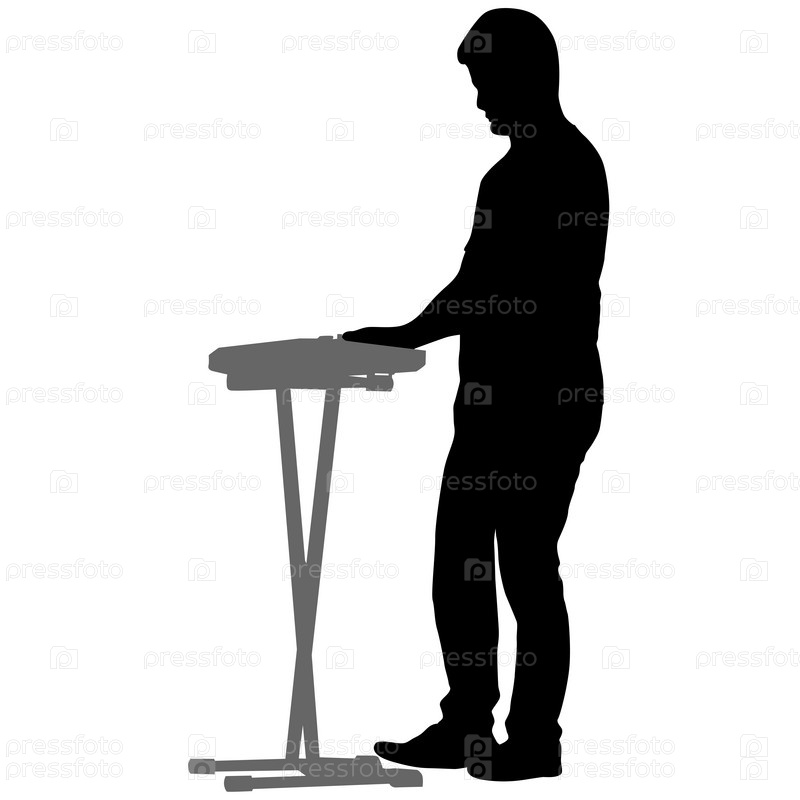 Силуэт-музыкант играет на синтезаторе на белом фоне