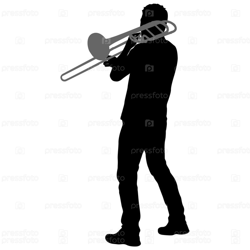 Силуэт музыканта, играющего на тромбоне на белом фоне