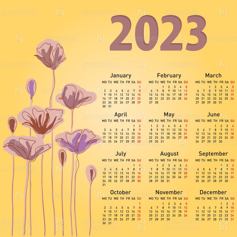 Стильный календарь с цветами на 2023 год. Неделя начинается в понедельник