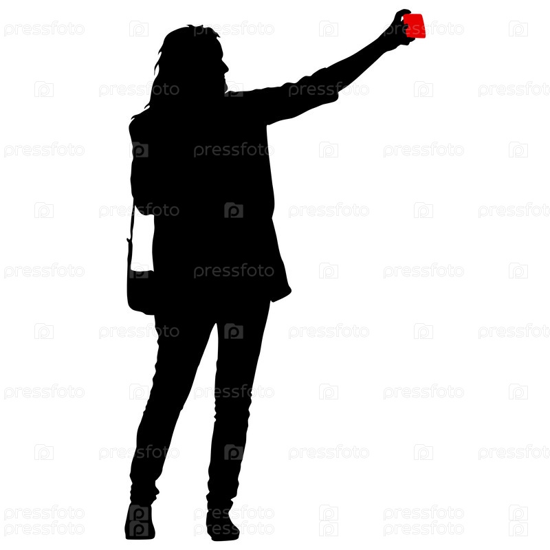 Силуэты женщины, делающей селфи со смартфоном на белом фоне