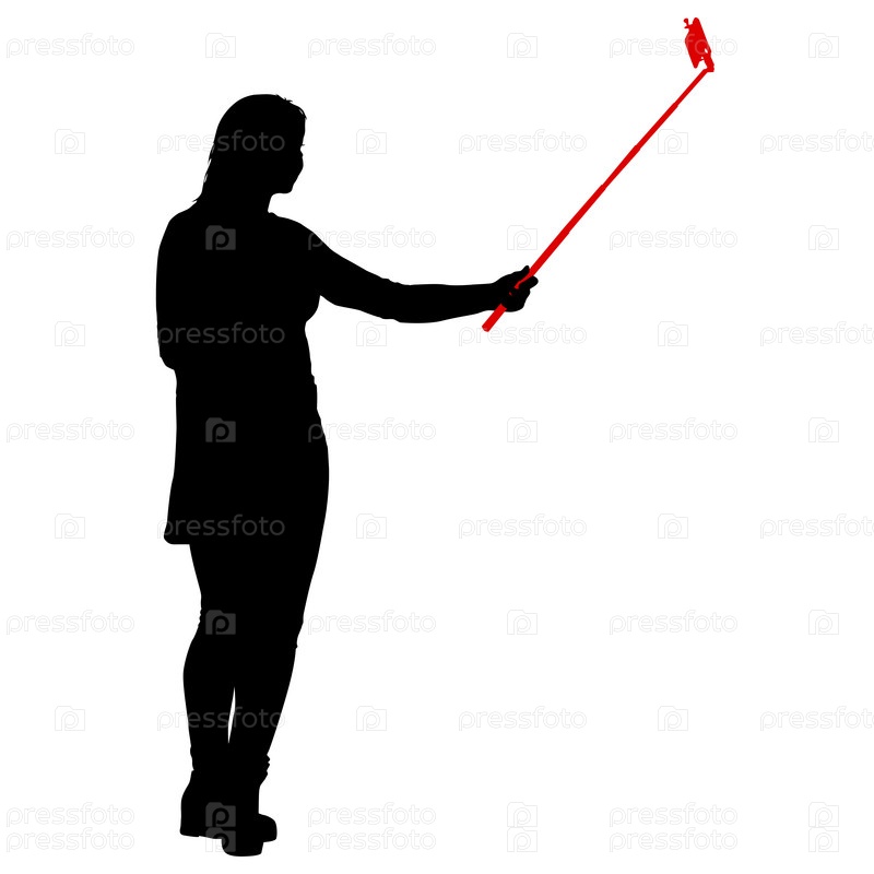 Силуэты женщины, делающей селфи со смартфоном на белом фоне