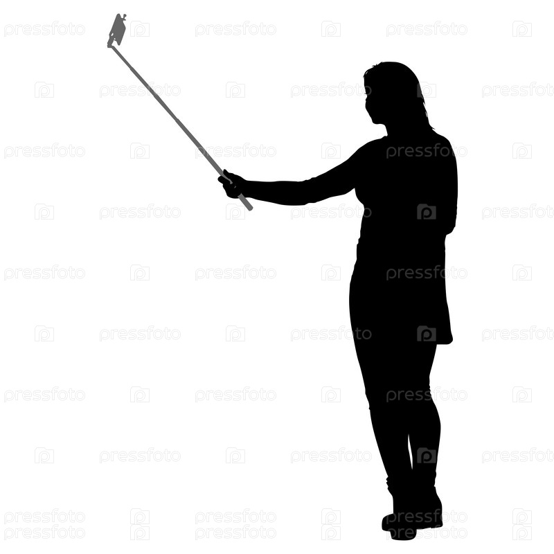 Силуэты женщины, делающей селфи со смартфоном на белом фоне