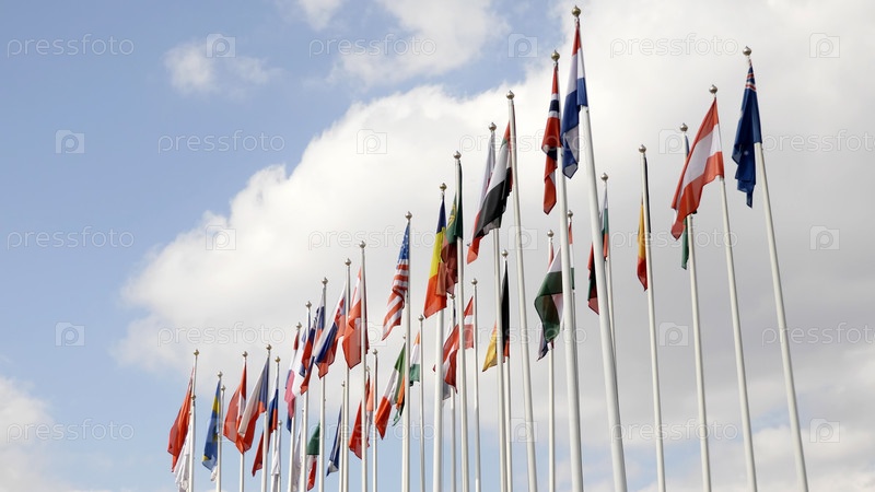 Различные национальные флаги с флагом ЕС под голубым небом