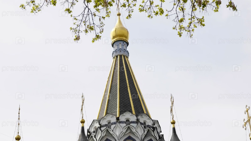 Золотой крест на крыше собора на фоне неба с облаками, Золотой крест на крыше собора на фоне неба с облаками