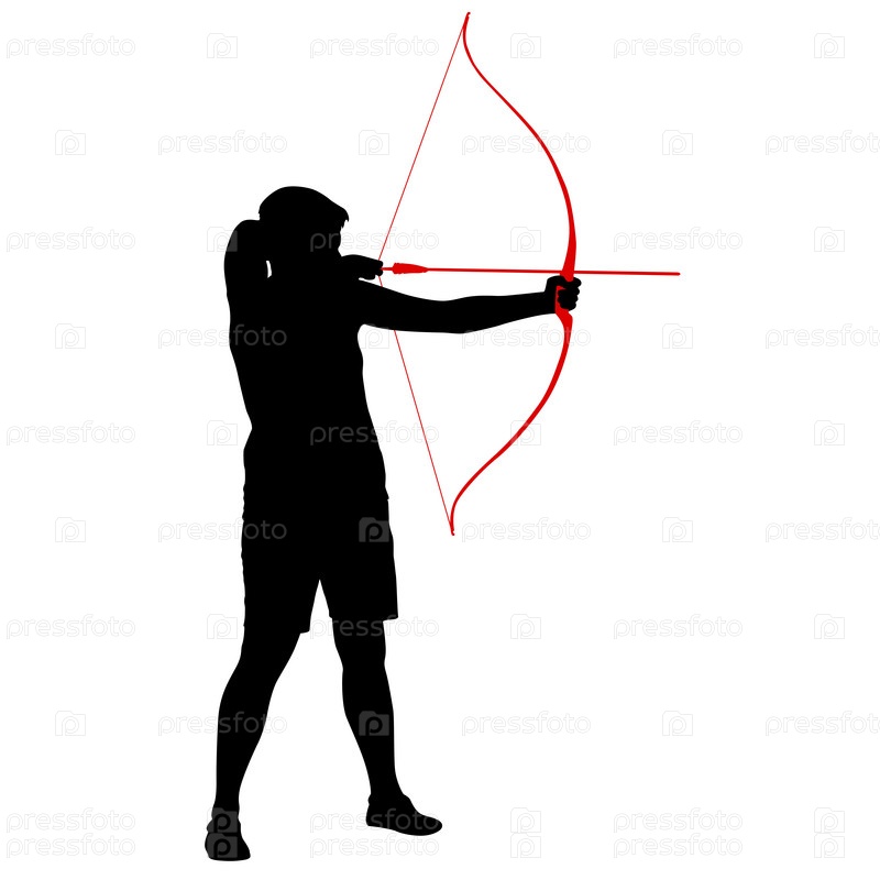 Силуэт привлекательной женщины-лучника, сгибающей лук и целящейся в цель