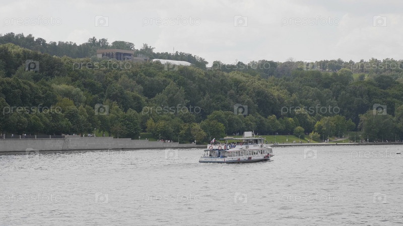 МОСКВА - 7 июня: прогулочный катер, плывущий под Крымским мостом 7 июня 2018 года в Москве, Россия