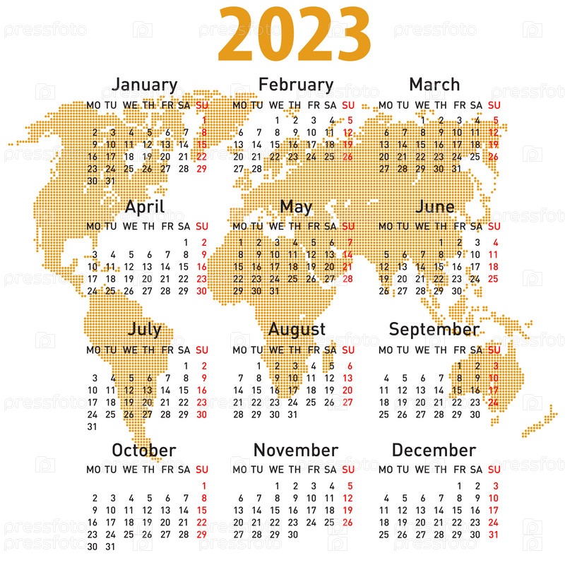 Календарь 2023 с картой мира. Неделя начинается в понедельник