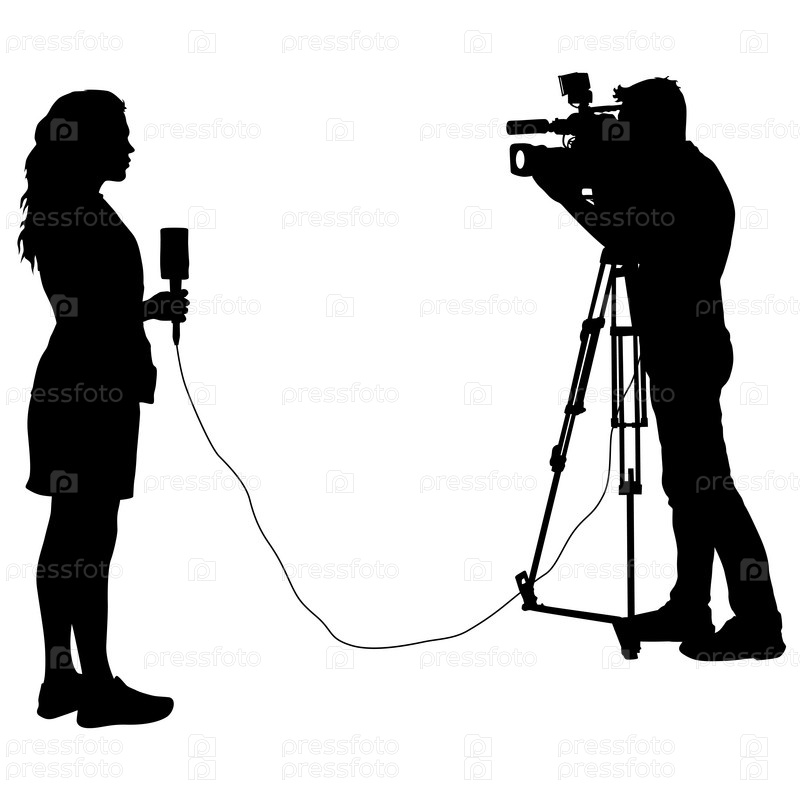 Оператор силуэта удаляет журналиста с микрофоном на белом фоне