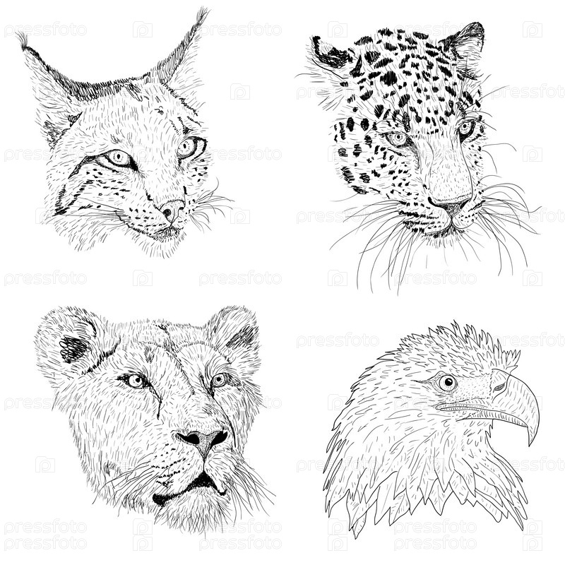 Установите эскиз силуэта эскиза орла, рыси, леопарда. Лицо льва на белом фоне иллюстрации
