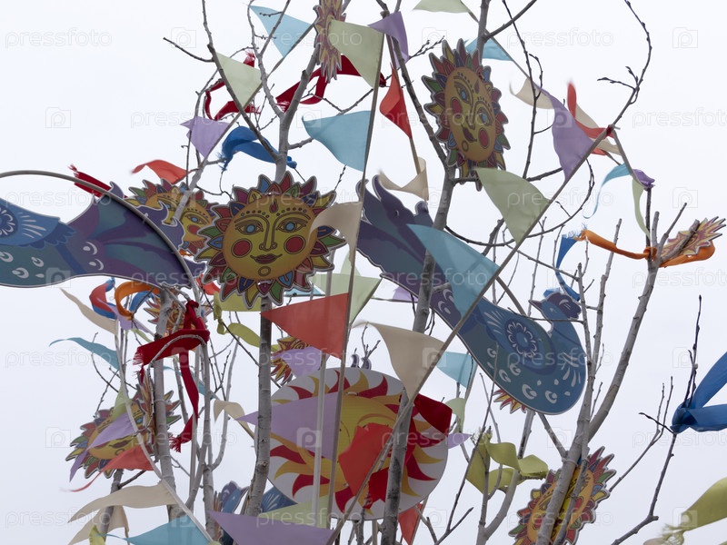 Масленичные украшения разноцветными лентами и изображениями солнца