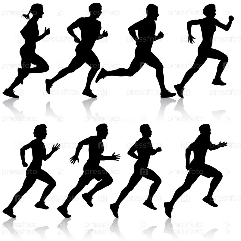 Набор силуэтов. Бегуны на спринте мужчины и женщины на белом фоне