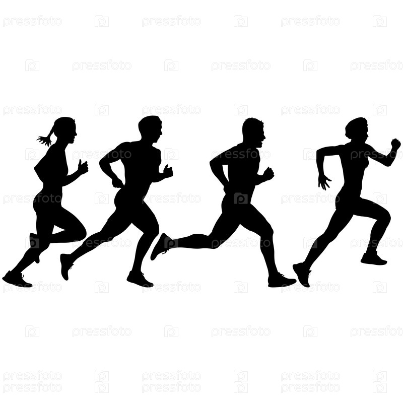 Набор силуэтов. Бегуны на спринте мужчины и женщины на белом фоне