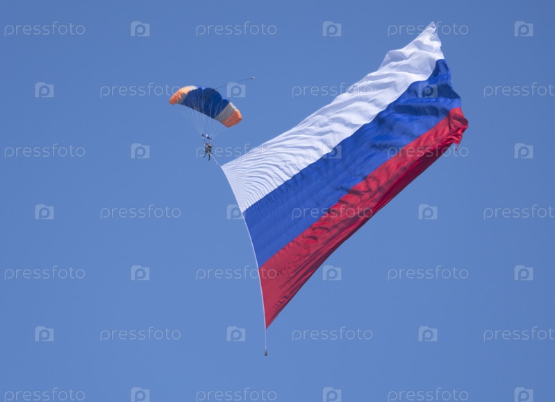 Москва, Россия, Аэродром Жуковский 31 августа 2019 года: Парашютные выступления, показательные выступления с флагом России на международном аэрокосмическом салоне МАКС-2019