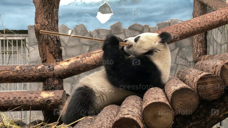 Панда ест на обед сочные бамбуковые ветки