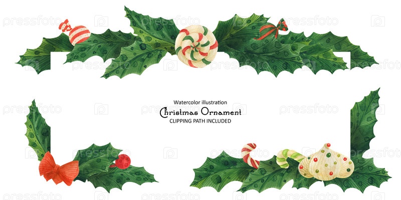 Рождественская граница падуба с леденцом, леденцом и зефиром, акварельная иллюстрация
