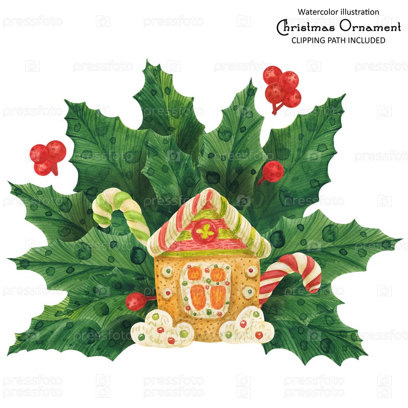 Рождественский букет падуба с пряничным домиком, акварельная иллюстрация