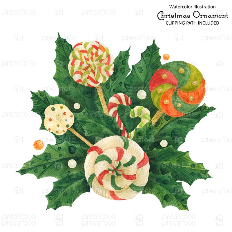 Рождественский букет падуба с леденцом на палочке и леденцом, акварельная иллюстрация