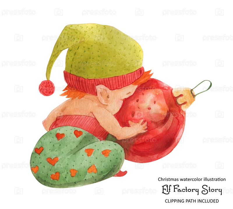 История рождественского эльфа, ребенок-эльф смотрит на рождественский шар