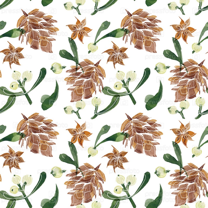Рождественская цветочная акварель бесшовный узор на белом фоне. Еловые шишки и омела. Бесшовный декор для милых рождественских и новогодних поздравлений и приглашений