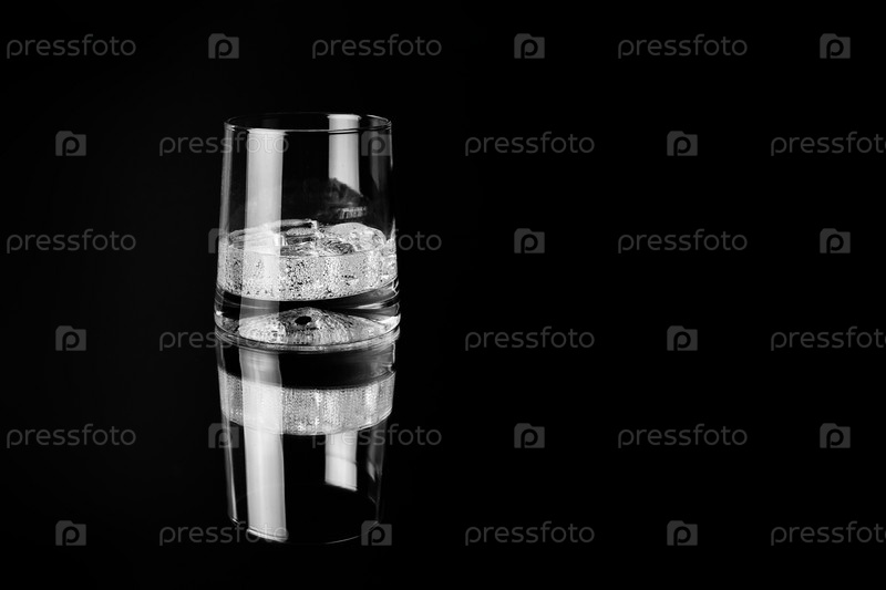 Стеклянный стакан с кубиками льда и газировкой на черной поверхности зеркала