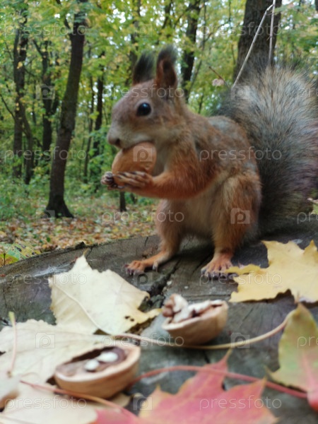 Белка начала линять и сидит на пеньке, грызет грецкий орех в скорлупе