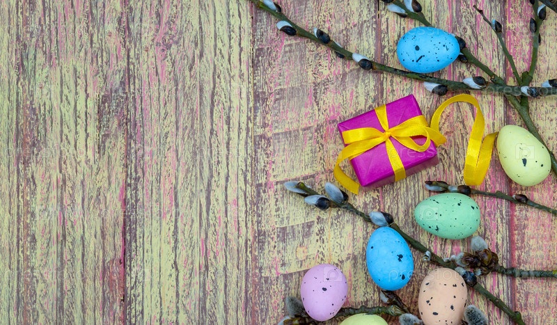 Подарочные коробки с лентами. Пасхальные яйца. Веточки ивы. Святая Пасха. Синий бирюзовый фон