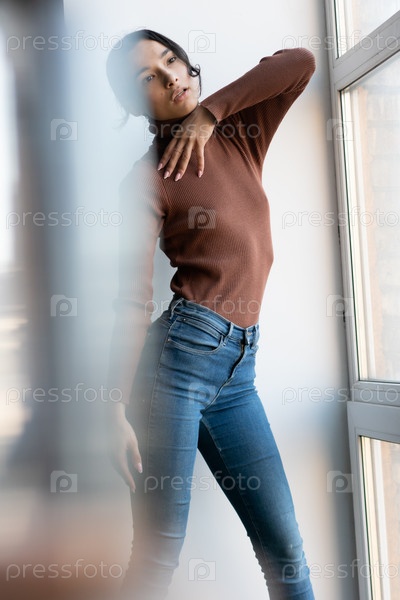 молодая красивая женщина позирует в голубых джинсах возле окна