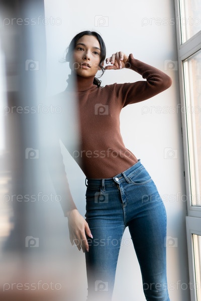 молодая красивая женщина позирует в голубых джинсах возле окна