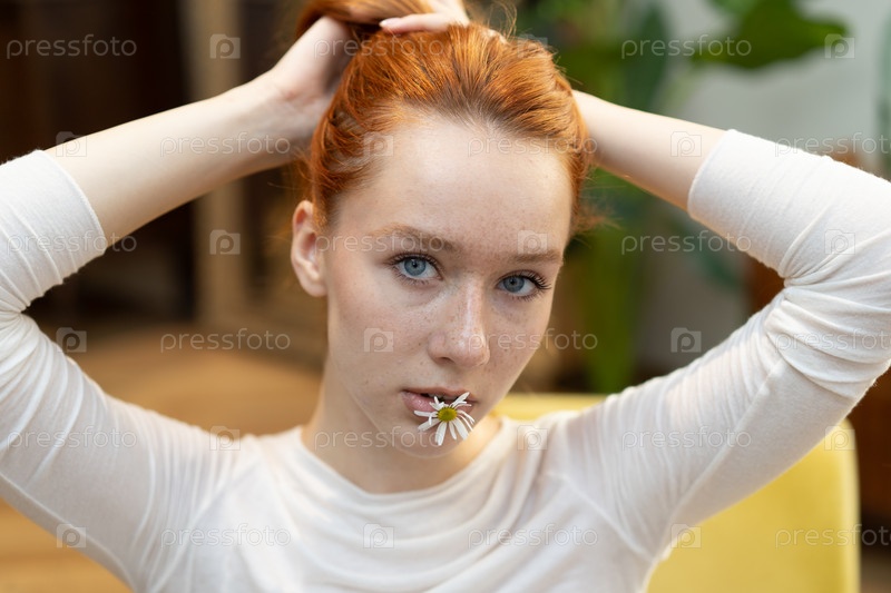 Портрет молодой красивой женщины с рыжими волосами в студии
